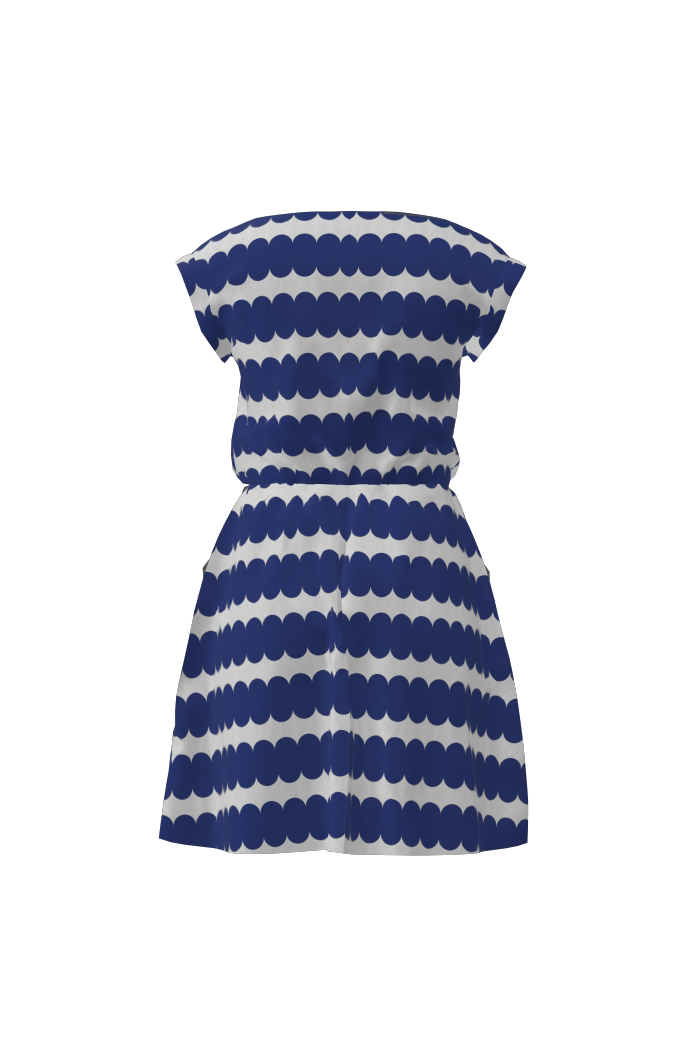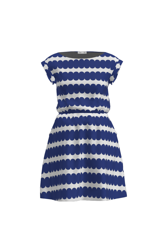 Kim har båthalsurringning fram- och baktill. Sidfickor och midjeskärning med resår ihop med vidd i kjolen. Kjolen går till nedre delen av låret. Passformen i klänningen lös och ledig, både upptill som över mage och stuss.