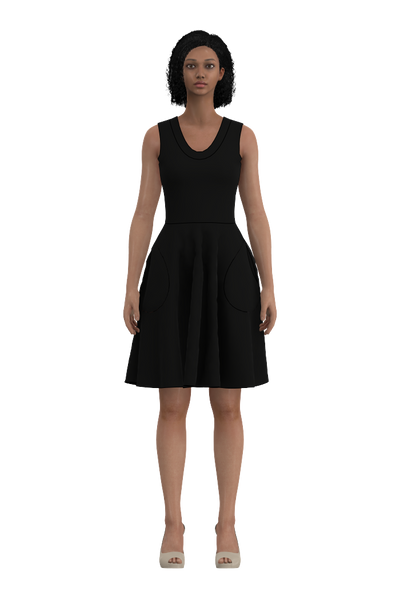 Stina har vändsydd krage med djupare urringning framtill. Sidfickor och midjeskärning ihop med vid, klockad kjol. Kjolen går till strax under knät och passformen i klänningen är tajt upptill med lös kjolpassform.
