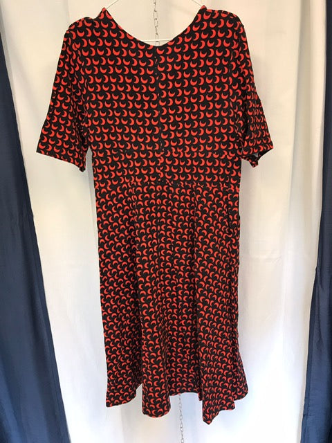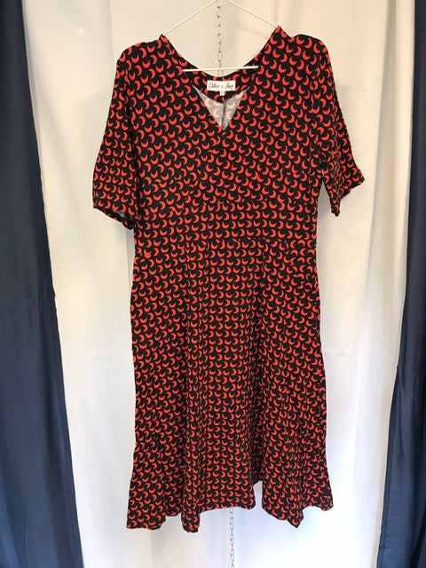 Överdelen är i omlott-modell med åtsittande liv med djupare, v-formad urringning framtill. ¾-ärm, sidfickor och smickrande skärning i midjan. Klockad kjol med härlig vidd, som slutar strax under knät.