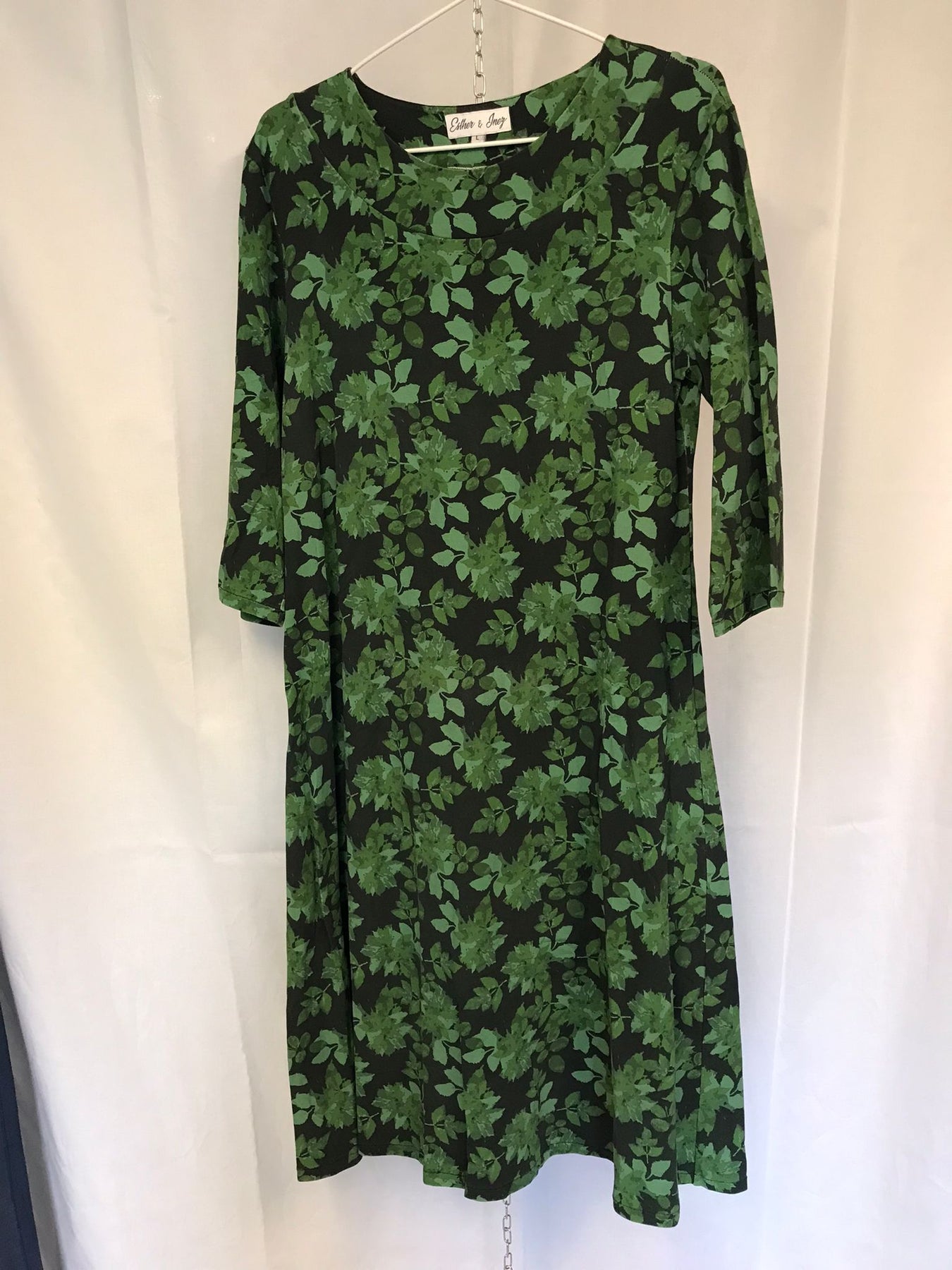 Signe slutar strax nedanför knät på vaden och kragen är vändsydd. Längden gör att den funkar lika bra barbent som med strumpbyxor och leggings. Kjoldelen är lite lätt utställd för fint fall. Ärmlängden går ner under armbågen, en så kallad klassisk trekvartsärm. Passformen är tajt över byst och arm för att sen släppa och bli lösare över mage och rumpa. Halsringningen är rundhals som ligger på lagom avstånd från halsen, utan att ligga på men ändå täcka skönt.