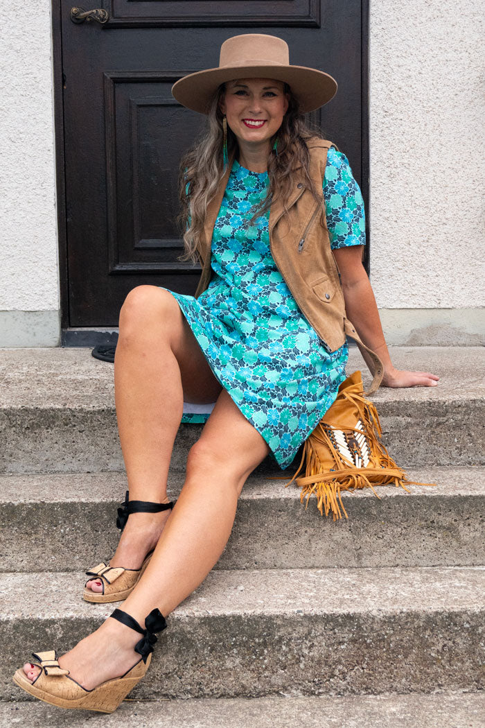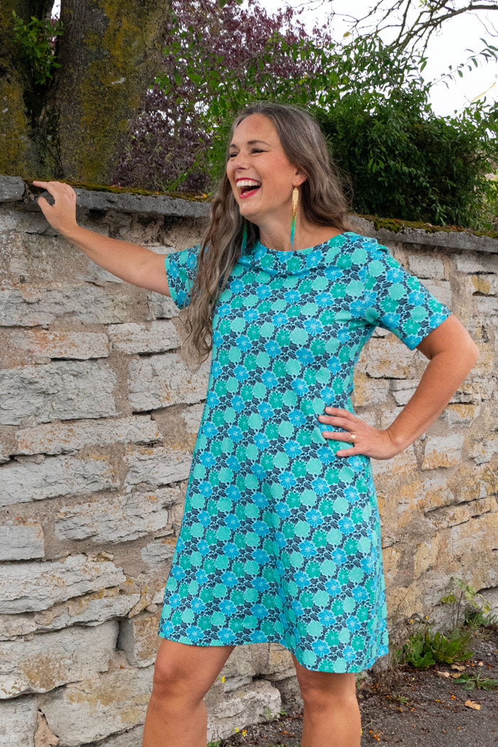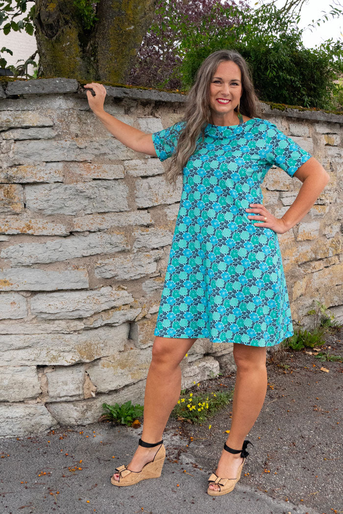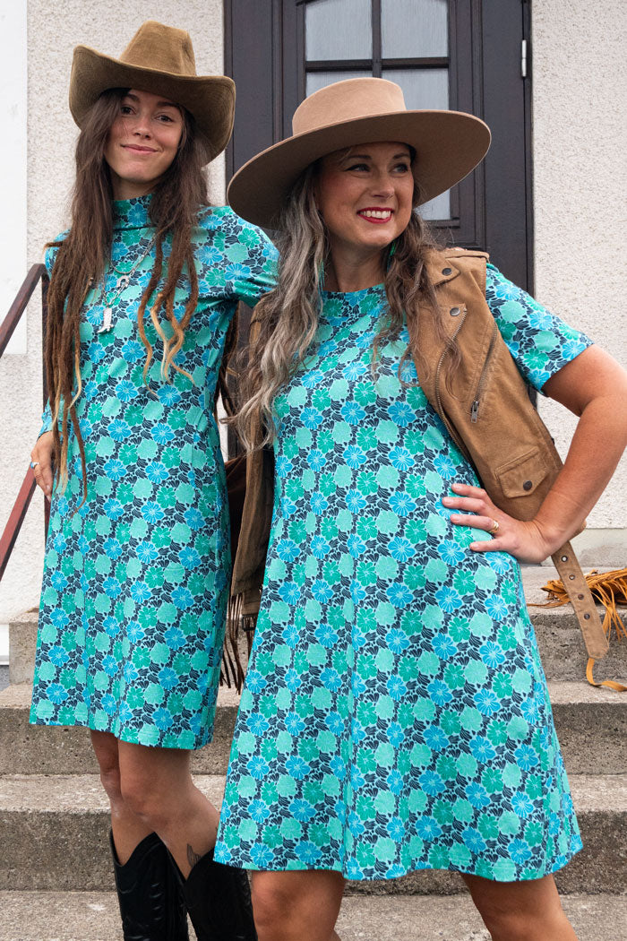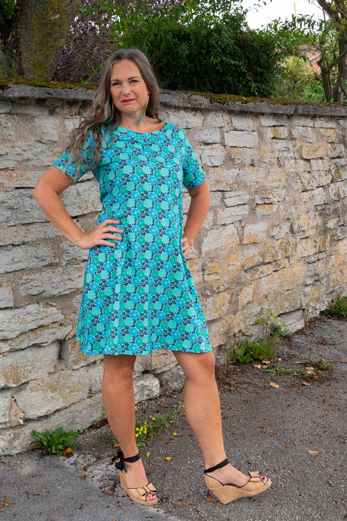 KLÄNNINGEN SARA I BLÅ TURKOST BLOMMÖNSTER - BEEFLOWER BLUE