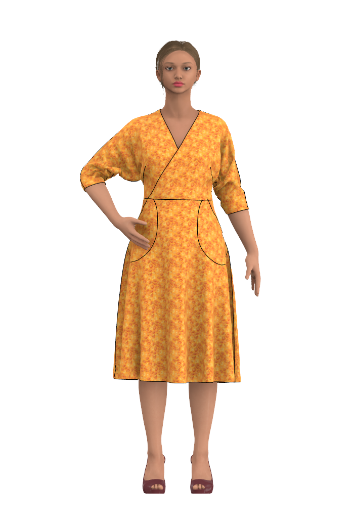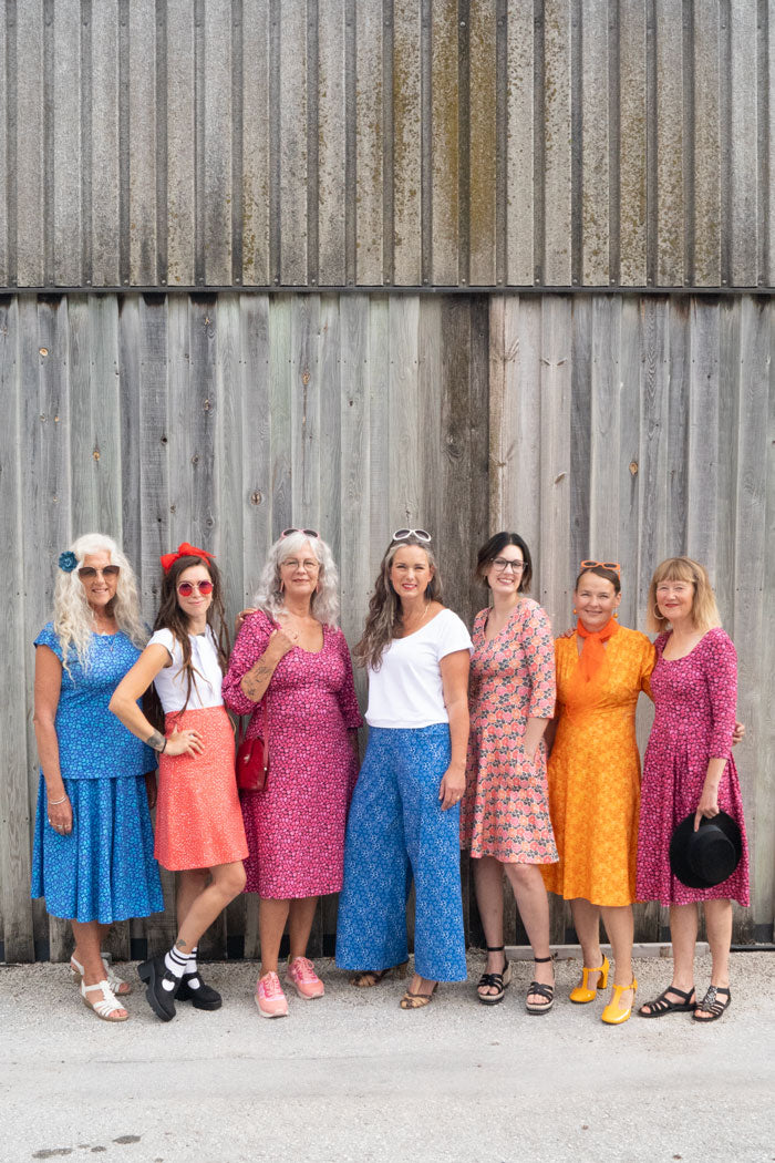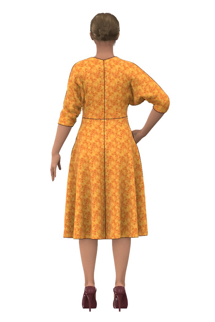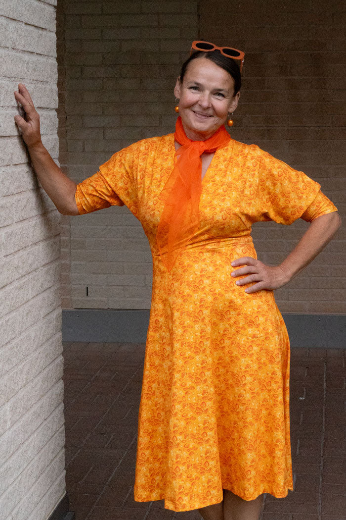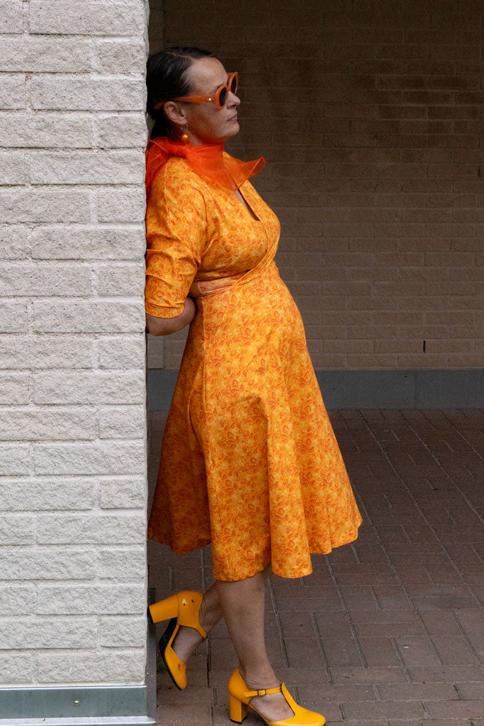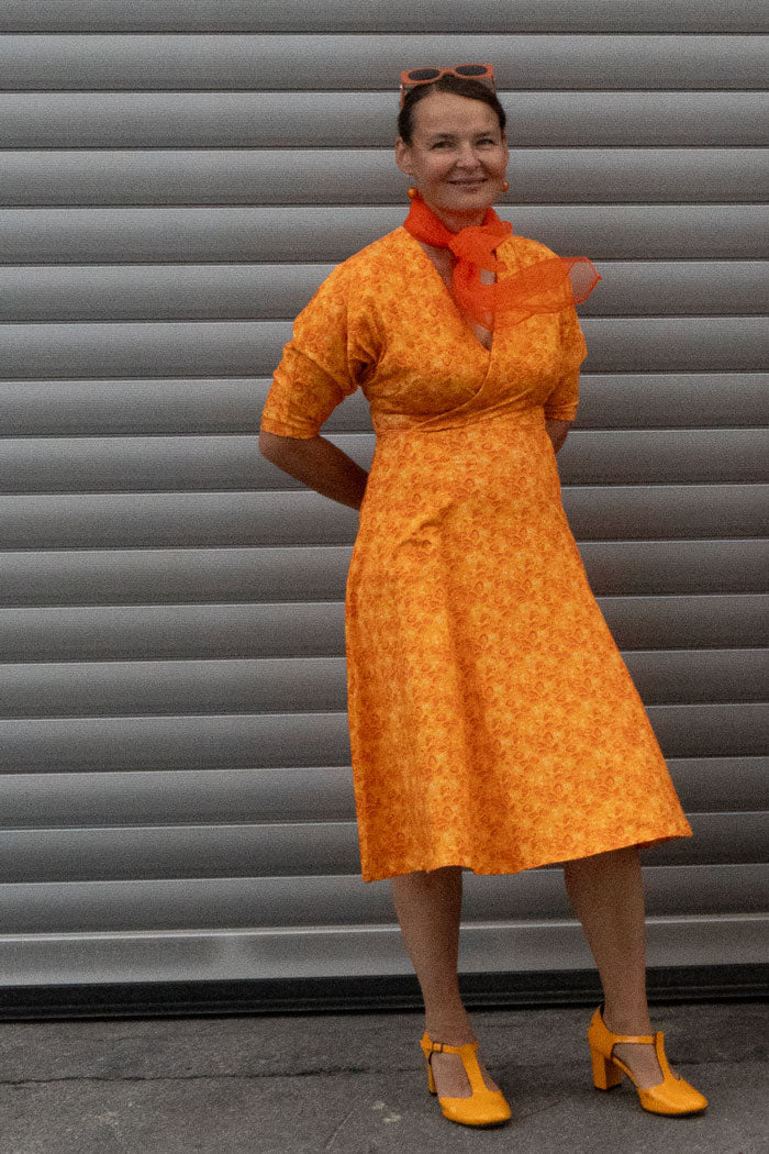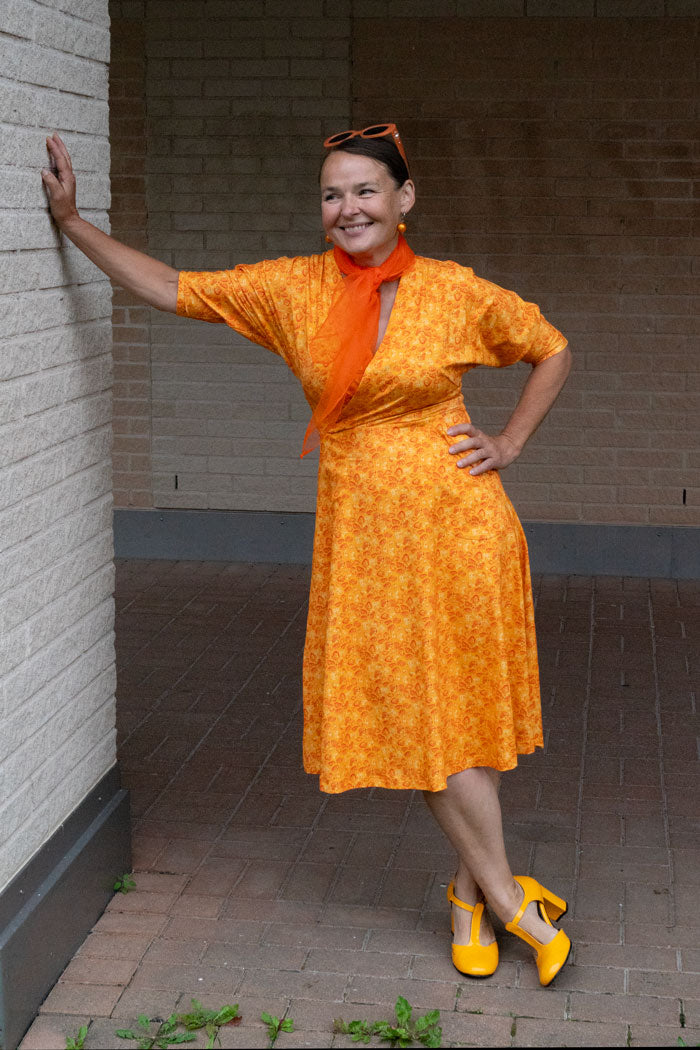 Das Kleid Elsa besticht durch seinen Schnitt im Stil der 50er-Jahre mit halblangen, sogenannten Fledermausärmeln und einer lockeren, lässigen Passform. Es hat eine betonte Taille und einen glockenförmigen Rock. Vorne und hinten befindet sich ein eleganter V-Ausschnitt. Selbstverständlich verfügt Elsa auch über bequeme Taschen und einen Brusteinsatz für eine schmeichelhafte Silhouette.