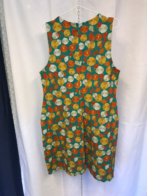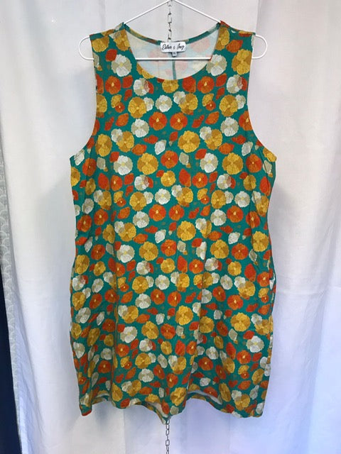 Anna har en tajt passform upptill vid byst och lite lösare över magen och hela vägen ner ihop med sidfickor. Längden på klänningen går till strax ovanför knäet.