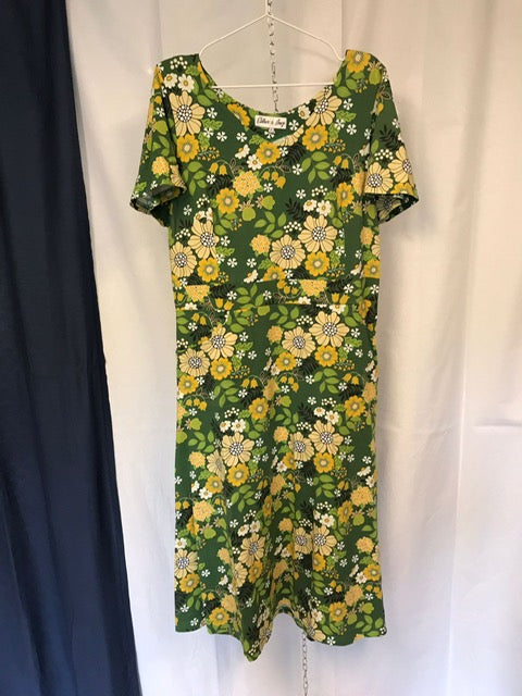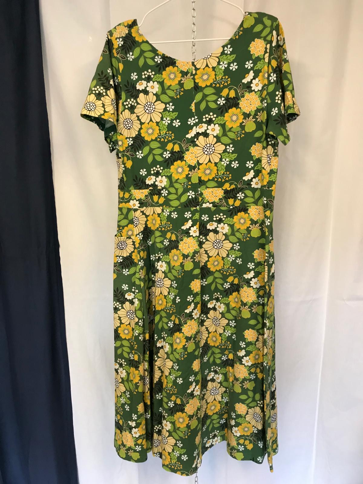 Kerstin har en fin v-formad urringning både fram och bak som passar bra med snygga halsband. Bystinsnitt för att optimera passformen och praktiska fickor fram som löper i linje med bystinsnitten. Längden går till vaden och passformen i klänningen är tight upptill och med klockad kjolpassform. Kjoldelen är utställd från stussen och ner. Ärmlängden går ner till strax ovan armbåge och är lätt utställd för en klockad form.