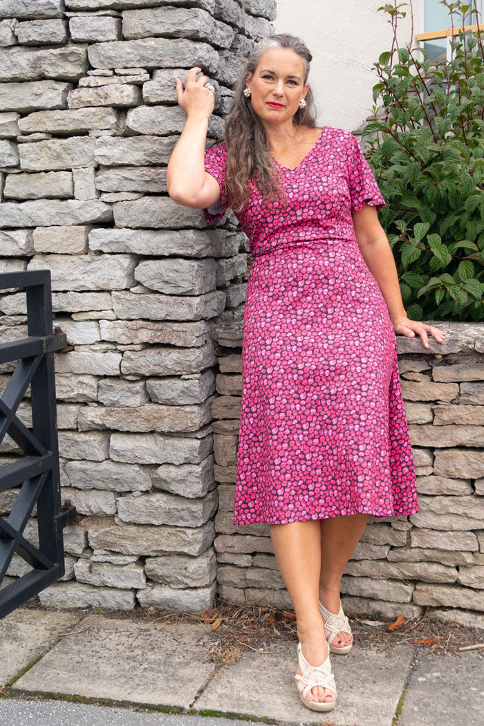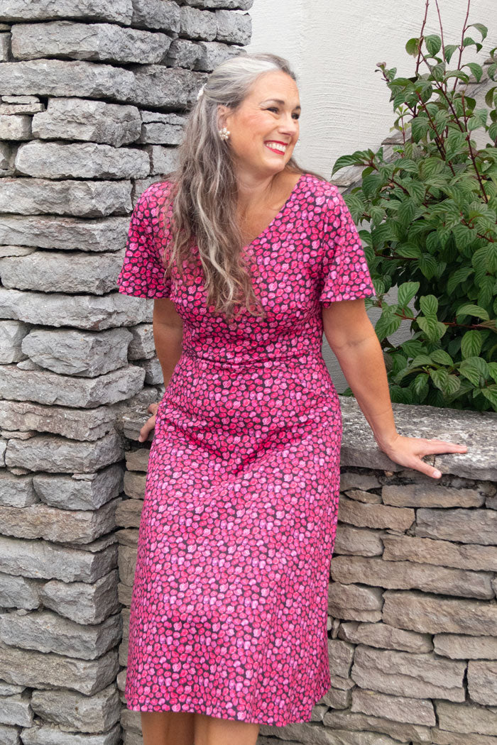 Kerstin Razie pink is one of our longer dresses, in soft organic cotton with a flowing silhouette that fits comfortably without feeling too tight. The defined waist flatters the figure, while the slightly flared sleeve adds movement and elegance.