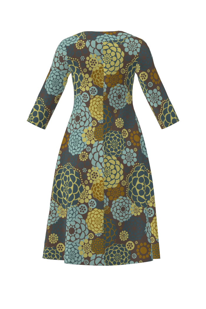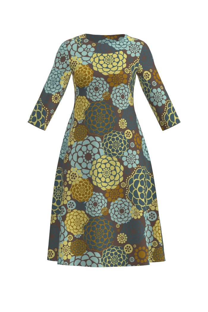 Signe ends just below the knee on the calf and the collar is reverse stitched. The length means that it works just as well barefoot as with tights and leggings. The skirt part is slightly exposed for a nice fall. The sleeve length goes down below the elbow, a so-called classic three-quarter sleeve. The fit is tight over the bust and arms and then loosens and becomes looser over the stomach and bum. The neckline is a round neck that lies at the right distance from the neck, without lying on but still covering comfortably.