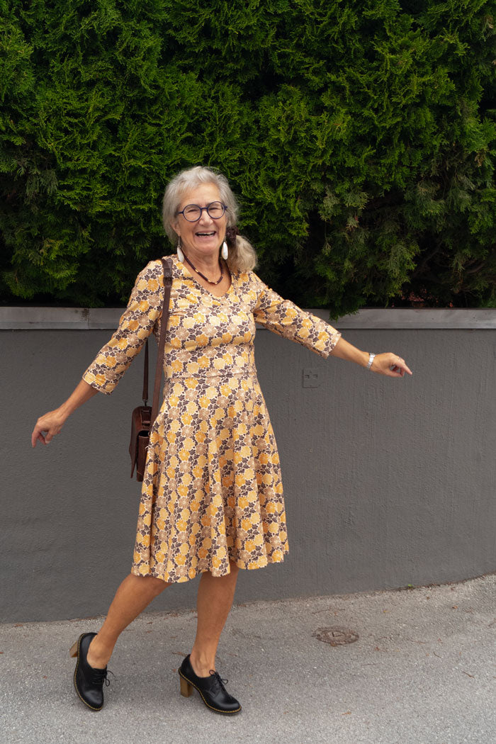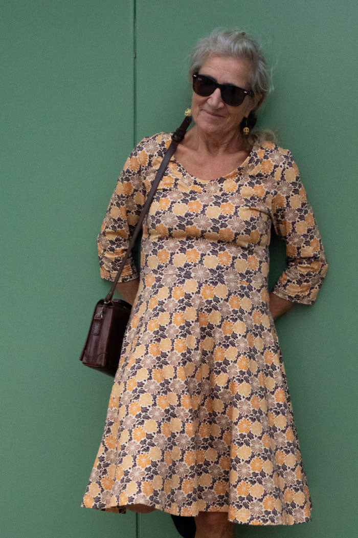 Stina in BeeFlower yellow is a wonderful dress where colorful design meets awareness. The pattern with flowers in yellow, gray and black tones gives a playful but stylish character, while the soft, organic cotton jersey feels supple and comfortable against the skin. With its bell-shaped skirt, the dress moves beautifully with every step - an elegant silhouette that feels free and light.