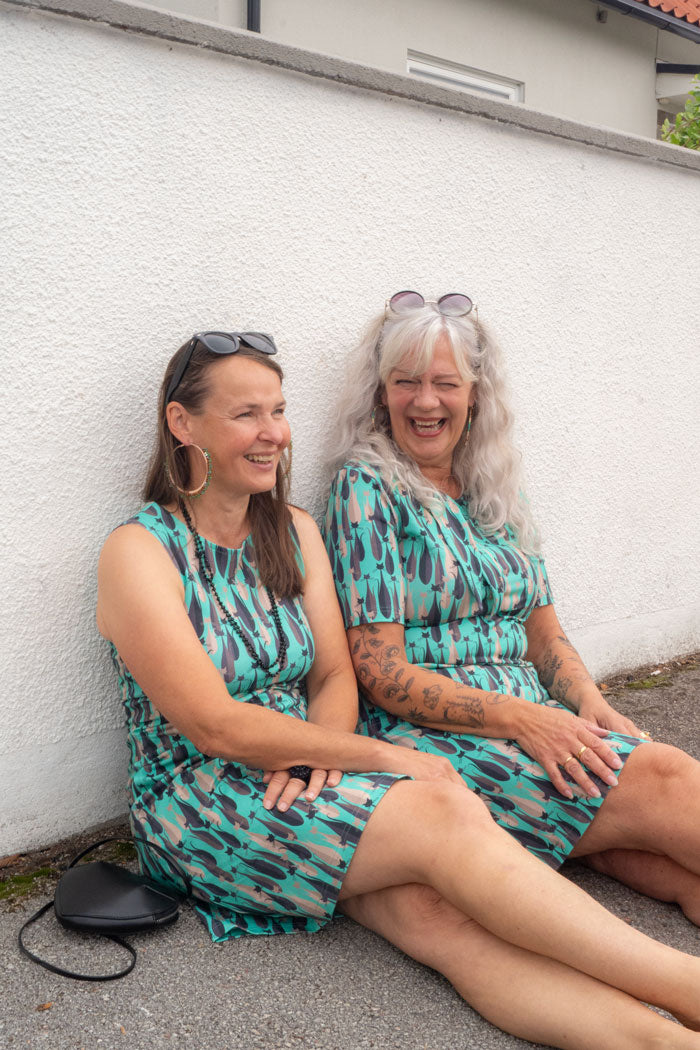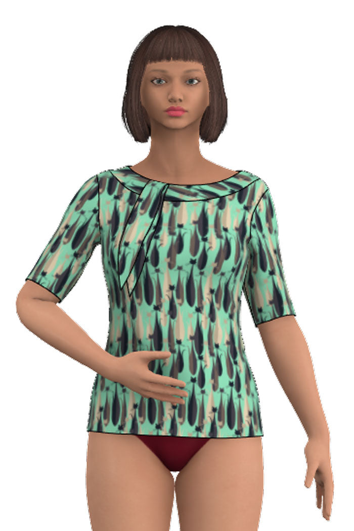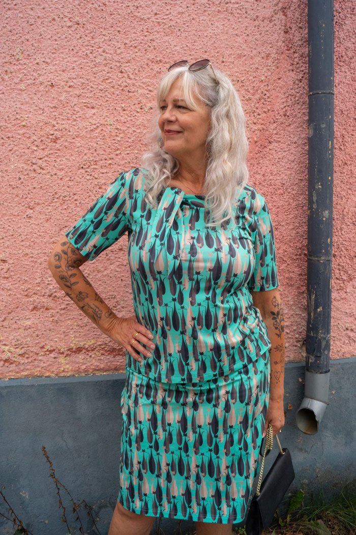 Sanna RetroCats turquoise is a lively and characterful sweater in organic cotton with a soft fit and an eye-catching pattern with cats in a lovely turquoise color. It has half-length sleeves and a round neckline with a tie detail that gives an elegant and slightly romantic feel.