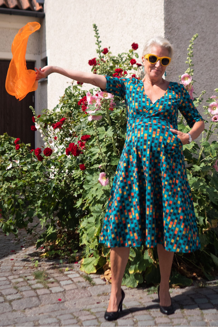 Överdelen är i en omlott-modell med ett åtsittande liv och en djup, v-formad urringning framtill. Den har en ¾-ärm, sidfickor och en smickrande skärning i midjan. Kjolen är klockad med en härlig vidd och slutar strax under knät, vilket ger en klassisk och tidlös silhuett.