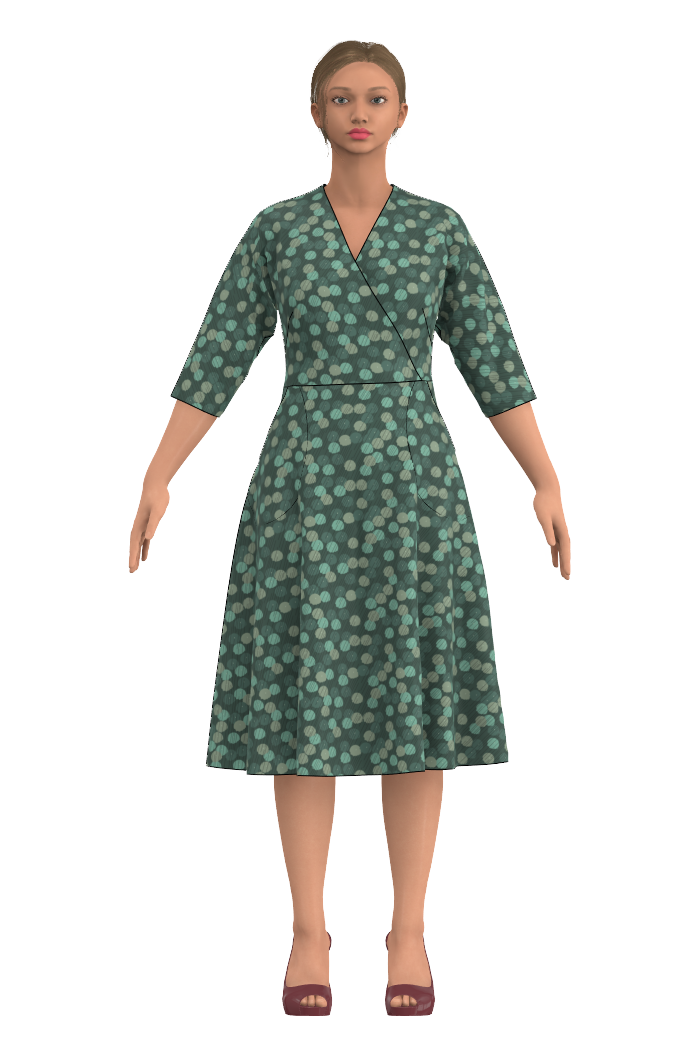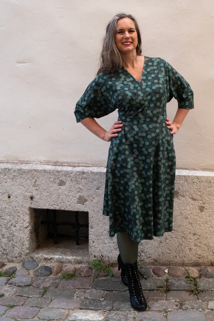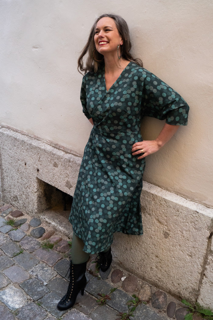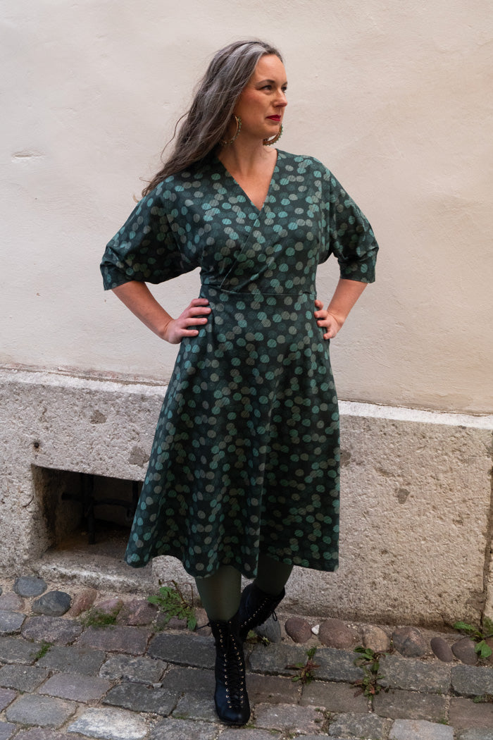 Den vackra V-ringningen ramar in byst och halslinje på ett smickrande sätt, medan de generösa batwing-ärmarna skapar en luftig och modern siluett. Tillsammans ger de klänningen en skön och självklar rörelse, samtidigt som helhetsintrycket känns elegant och avslappnat.