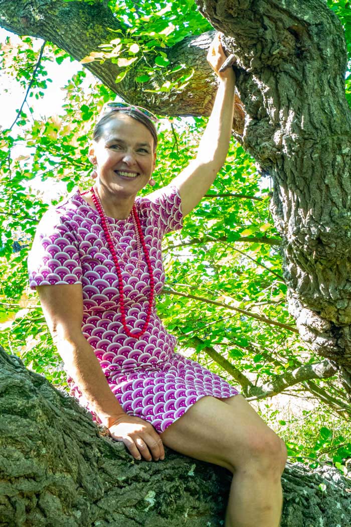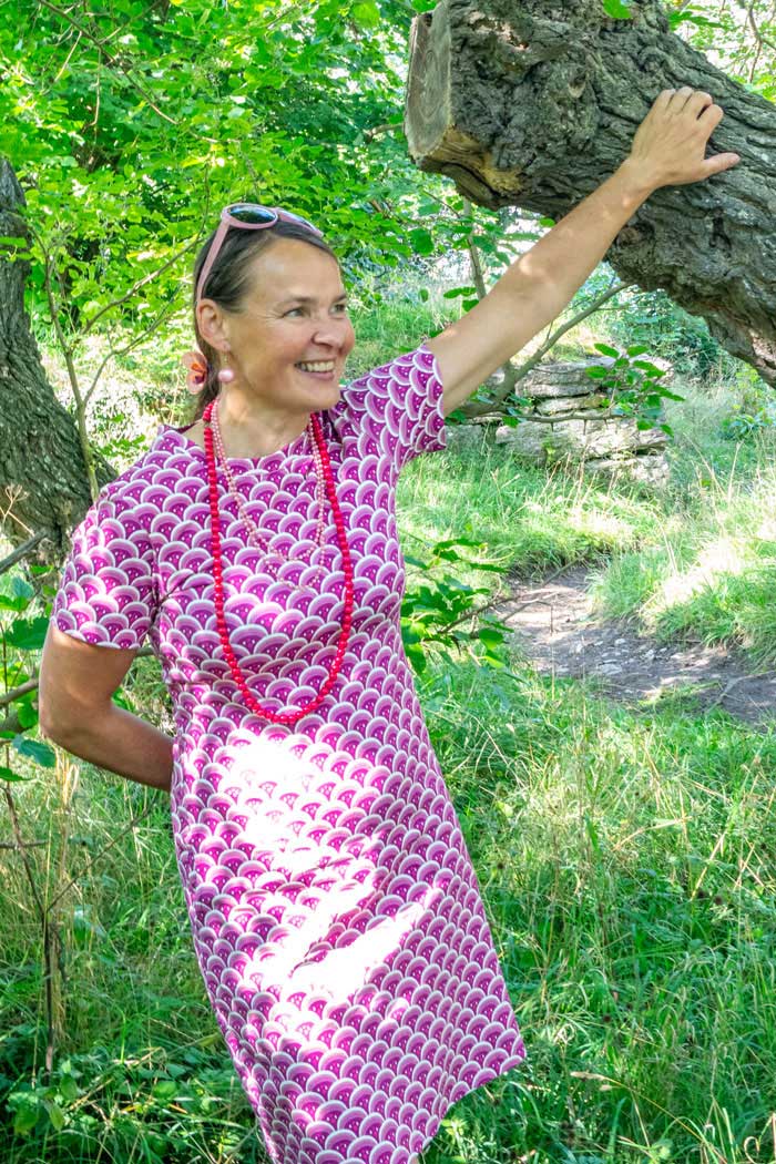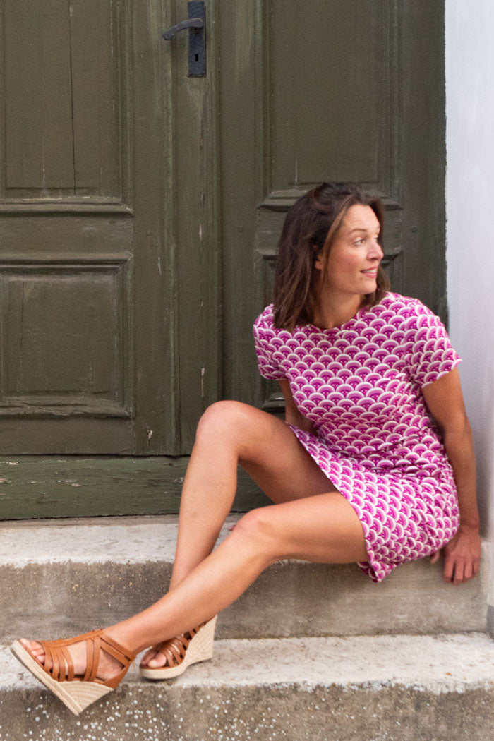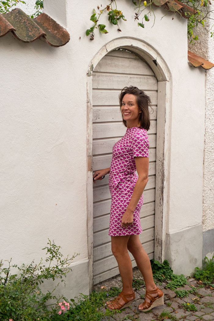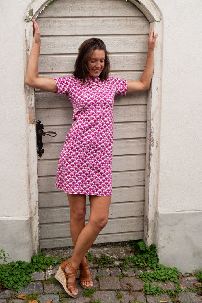 T-shirt-inspirerad men med en tydlig klänning-känsla med en luftig passform. Fanny har en klassisk rund halsringning med liten kort ståkant och korta ärmar som ger en balanserad siluett. Klänningen slutar en bit ovanför knäna och självklart har den också fickor! Den faller lätt kring kroppen och skapar ett avslappnat uttryck som passar lika bra till strandpromenaden och picknicken i parken som till sommarens kvällspromenader eller en brunch med vänner.