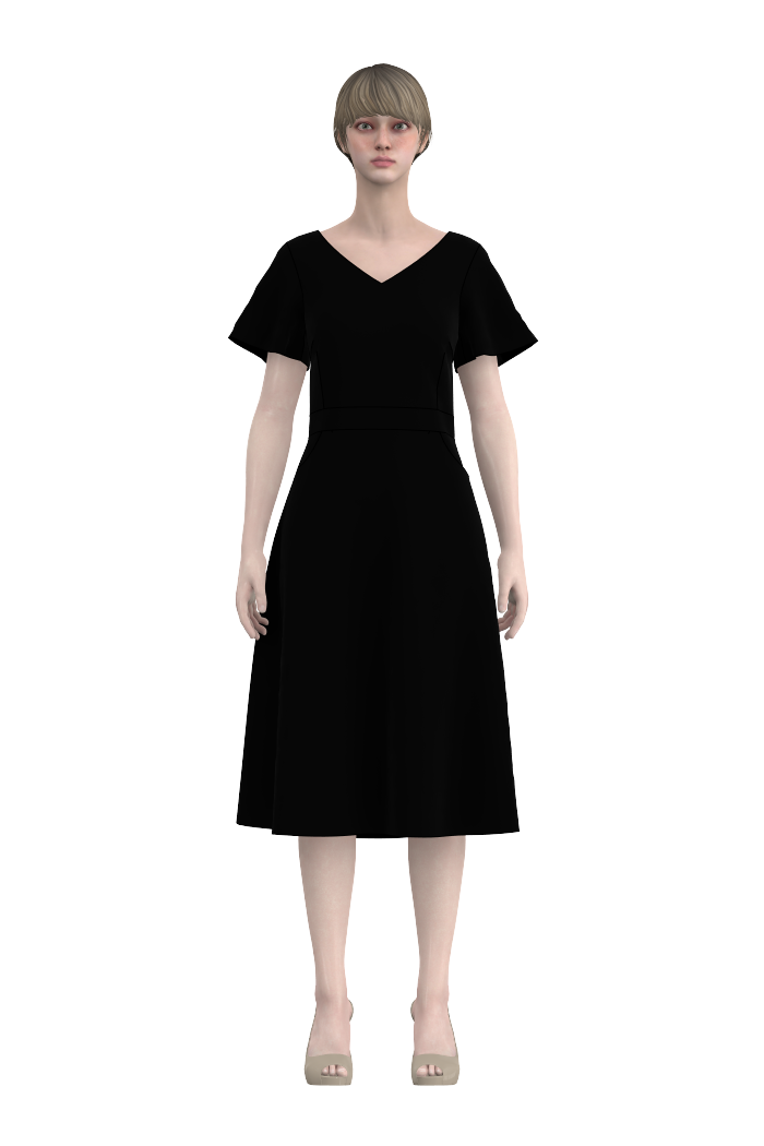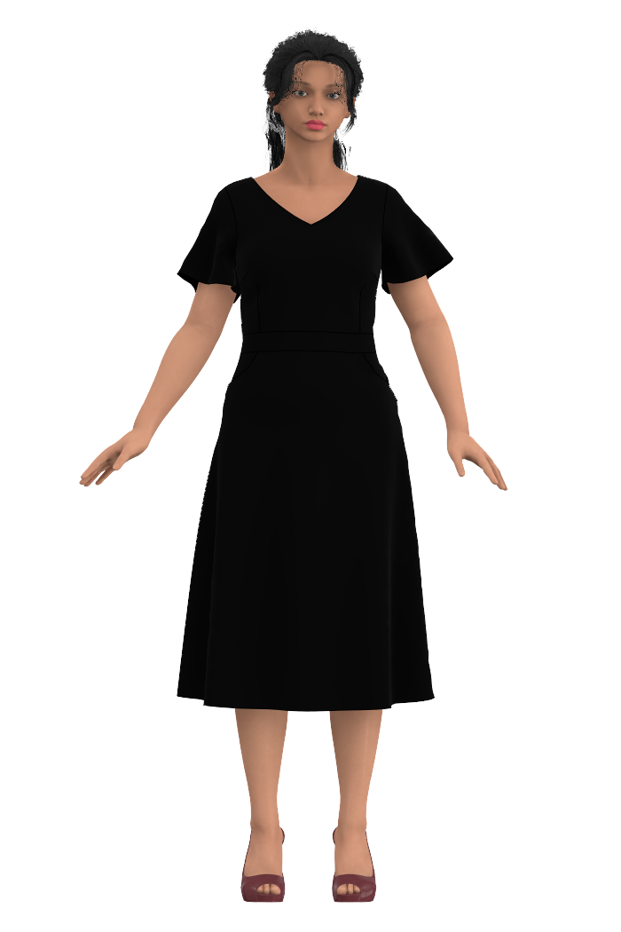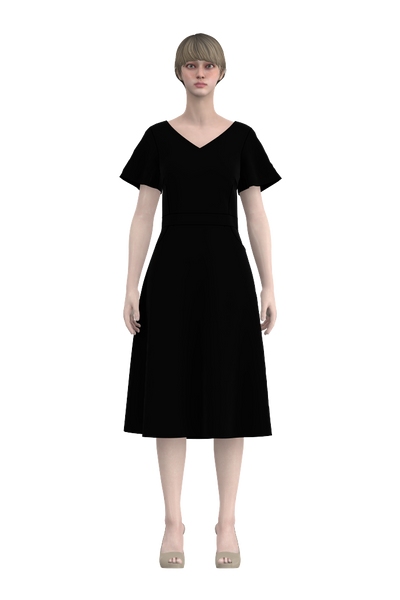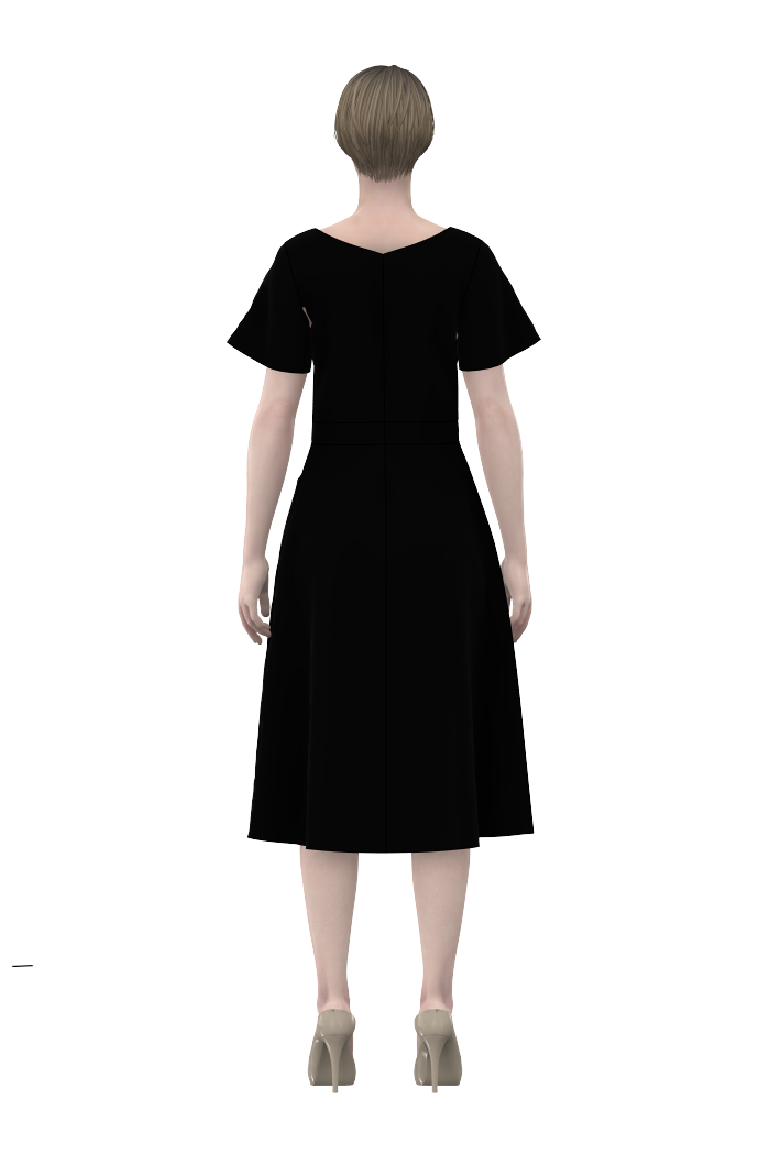 Kerstin har en fin v-formad urringning både fram och bak som passar bra med snygga halsband. Bystinsnitt för att optimera passformen och praktiska fickor fram som löper i linje med bystinsnitten. Längden går till vaden och passformen i klänningen är tight upptill och med klockad kjolpassform. Kjoldelen är utställd från stussen och ner. Ärmlängden går ner till strax ovan armbåge och är lätt utställd för en klockad form.