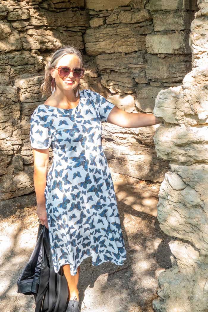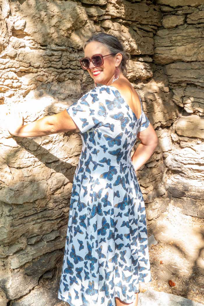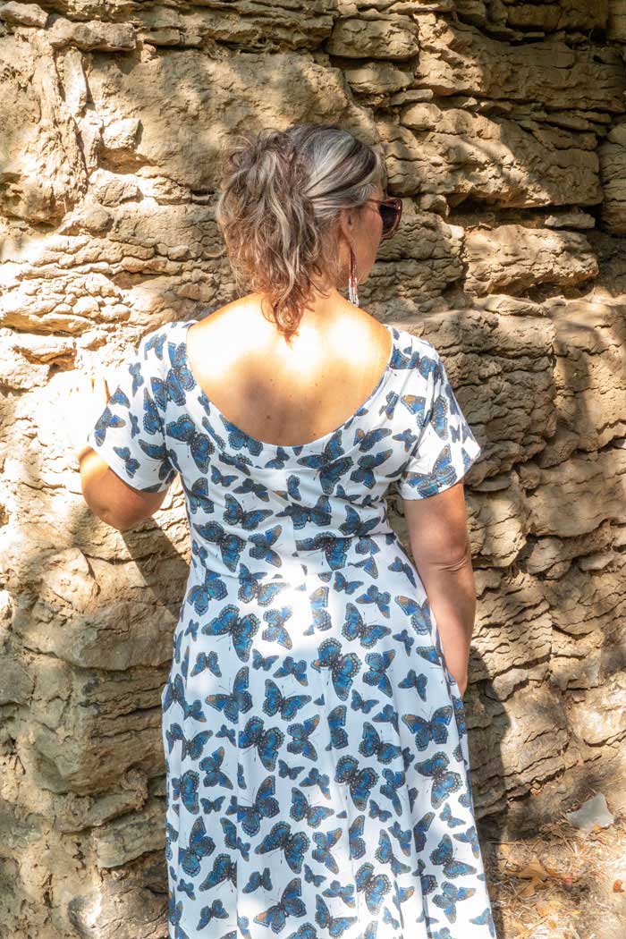 Malin är en klassisk romantisk klänning med en utsvängd kjol som har fickor. Hon har en smickrande båtkrage fram och en djupare u-formad urringning bak tillsammans med en kort ärm. Passformen är kroppsnära på överdelen ner till midjeskärningen och sen är kjolen klockad och sitter löst mot kroppen. Malin är den perfekta klänningen för varma sommardagar och är supersnygg att matcha med en kofta för kallare väder. En året runt-klänning att älska i många år.