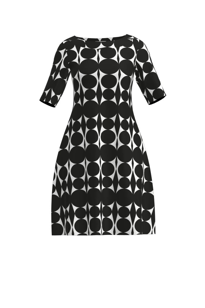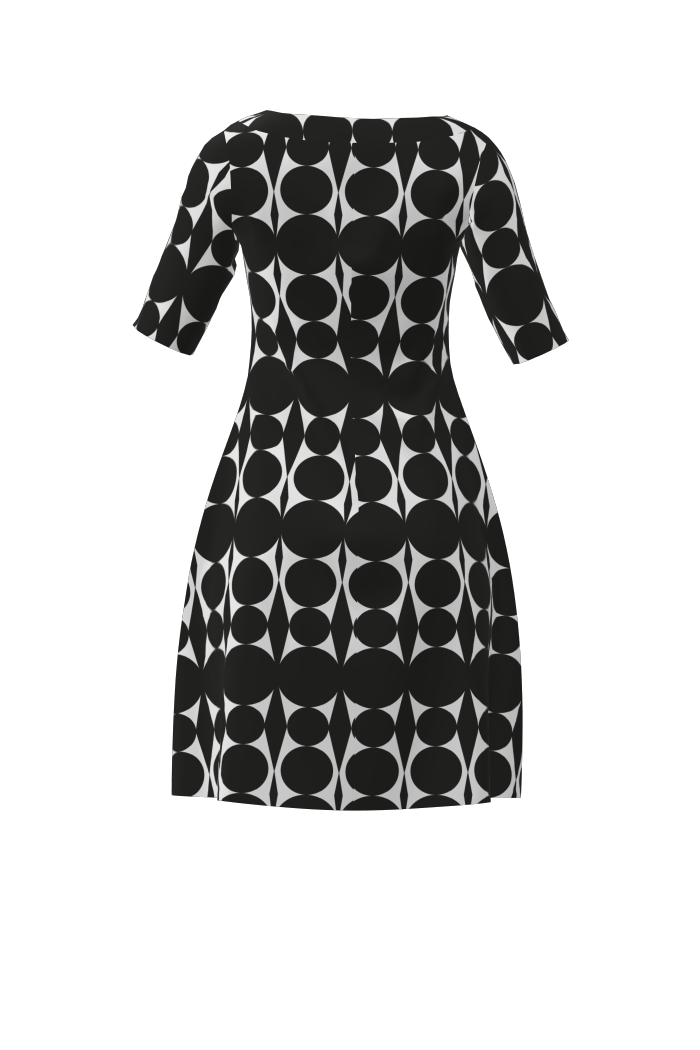 Klänning Sara slutar strax ovanför knät och båthalskragen är vändsydd. Längden gör att den funkar lika bra barbent som med strumpbyxor och leggings. Och på vintern hur bra som helst ihop med jeans! Kjoldelen är lite lätt utställd för fint fall och passformen är tajt över byst och arm för att sen släppa och bli lösare över mage och rumpa. Halsringningen är klassisk båthals som ligger på lagom avstånd från halsen utan att ligga på men ändå täcka bh-band.